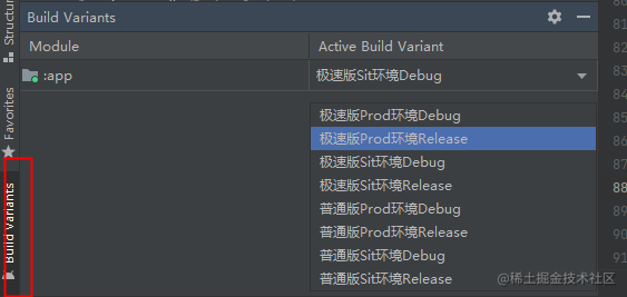 在左下角Build Variants面板选择你需要编译的apk变体版本